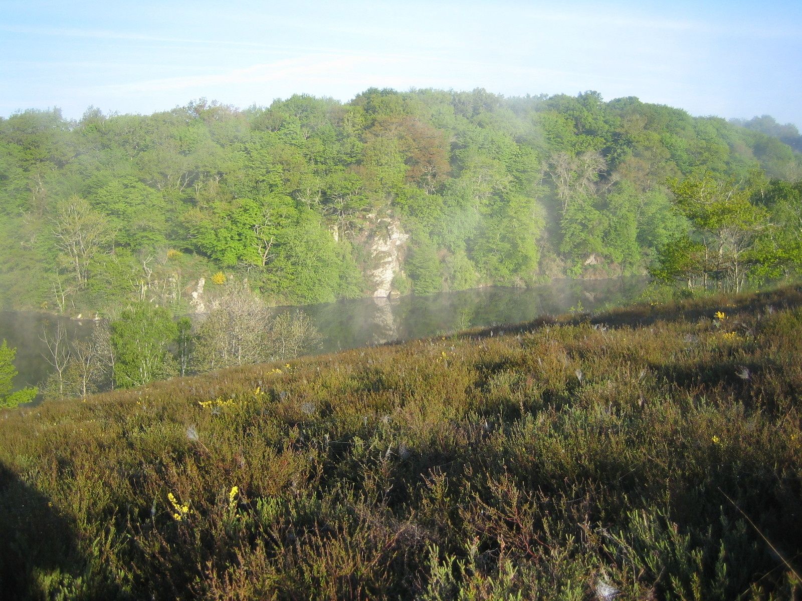 Sur la végétation plus aride de cette rive, composée en grande partie de bruyère, les araignées ont tissé leurs toiles qui retiennent les gouttelettes de rosée illuminées par le soleil, du plus bel effet !