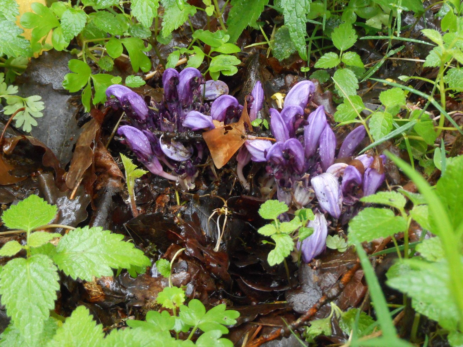 Au bout du lac, une petite passerelle nous facilite le passage au milieu des calthas en fleur. C’est également la période de floraison de la lathrée clandestine, étonnante fleur poussant au pied des arbres ; elle n’a ni feuille, ni chlorophylle : pas de vert dans la plante, seule cette couleur violet-pourpre ; elle vit en parasite des racines de l’arbre qui l’accueille.