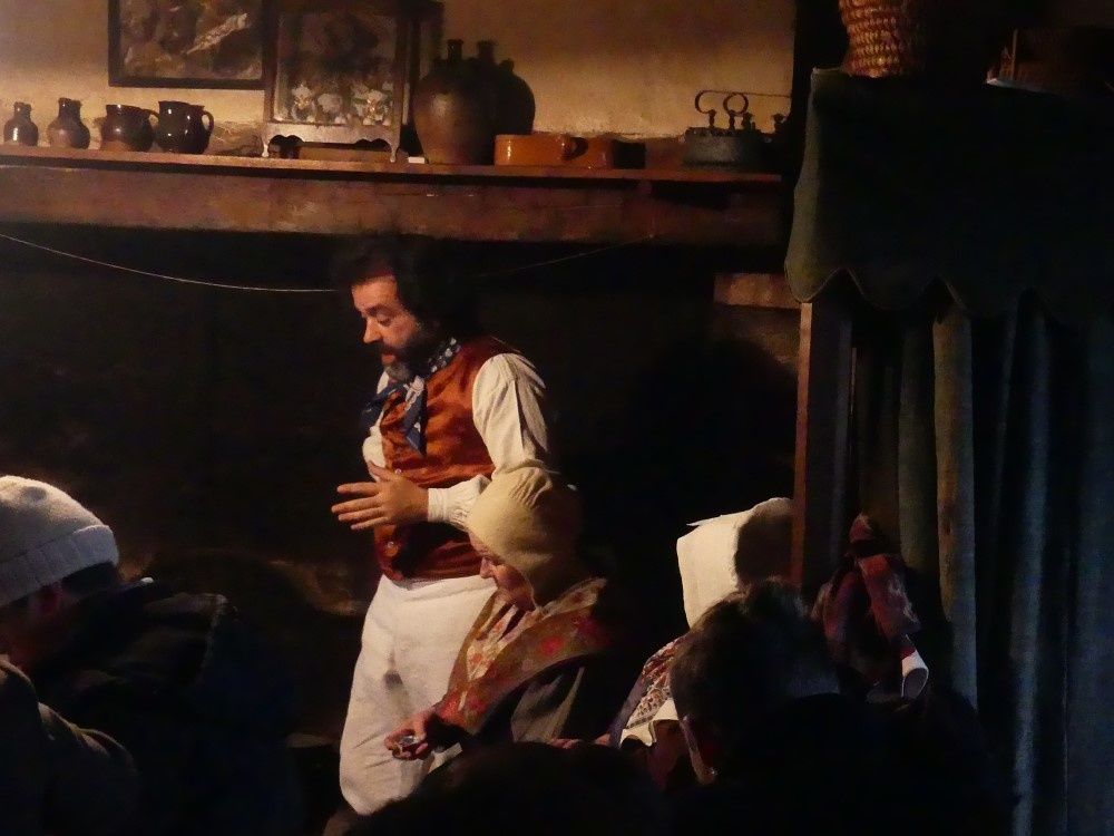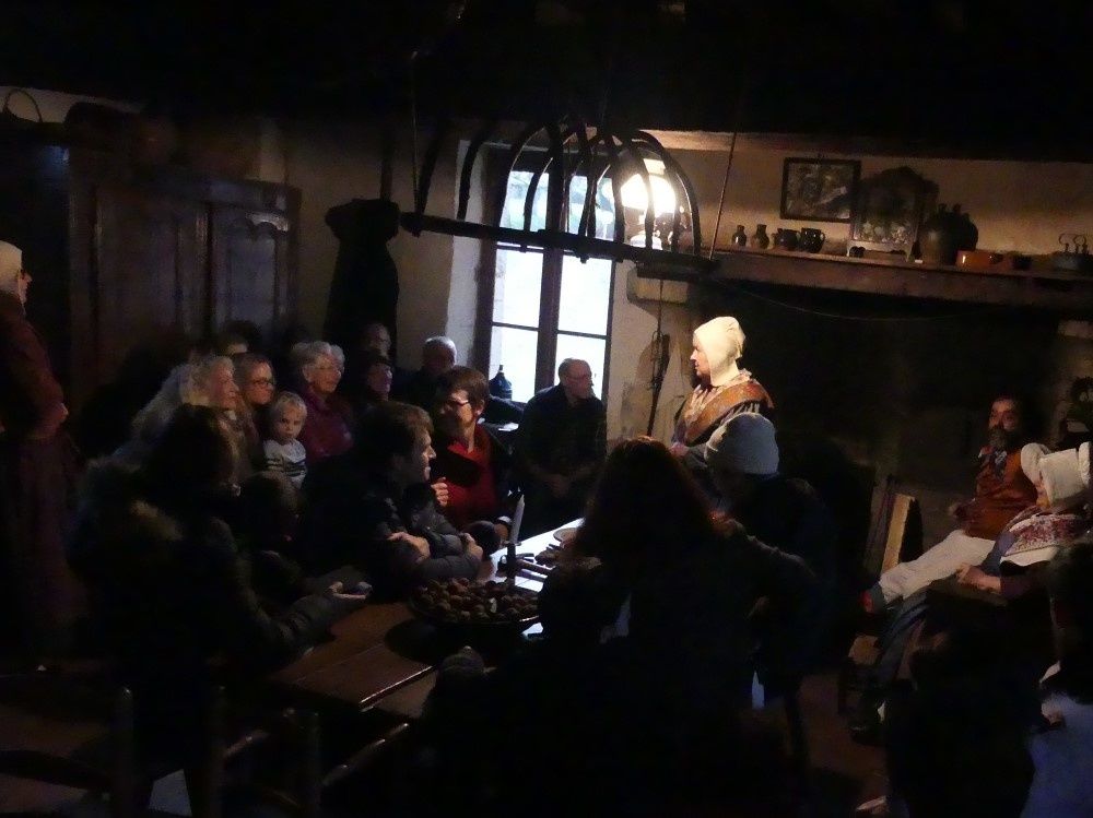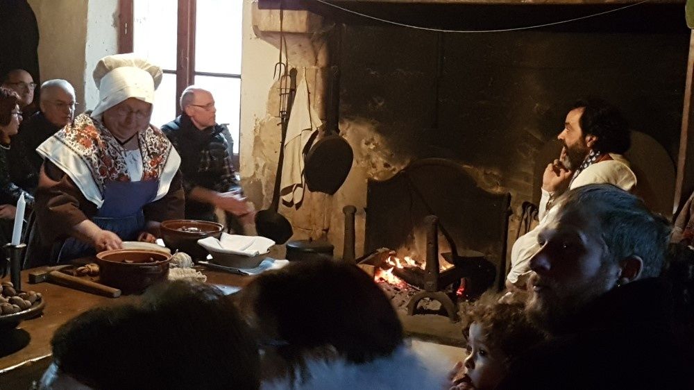 Il est maintenant temps de quitter le château pour rejoindre le domaine et tous les convives s’entassent dans la grande salle de la ferme, sombre, meublée de lits à quenouilles et de grandes armoires avec seichères, râtelier à pain et armurerie ! Installé autour de la table on casse les noix.