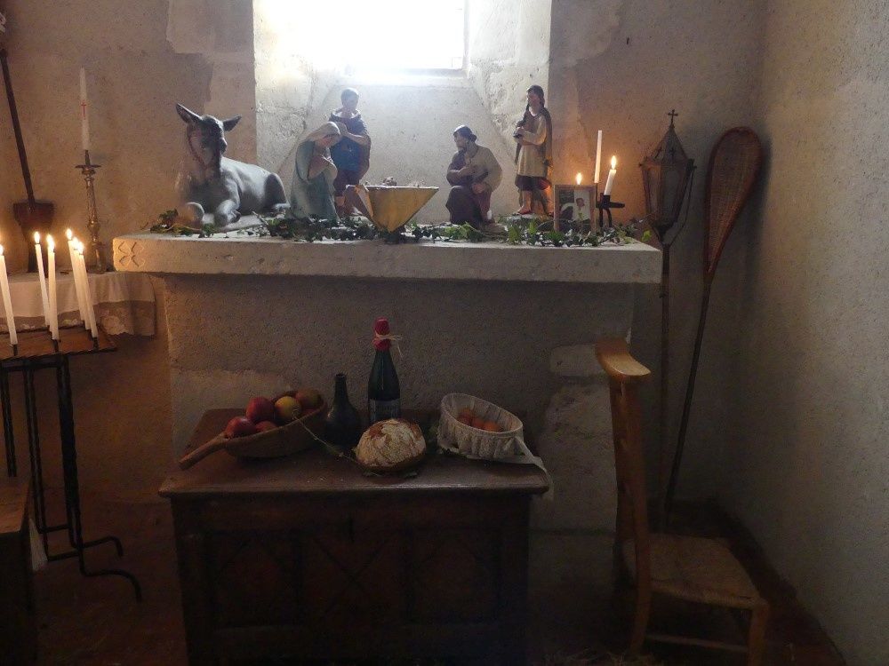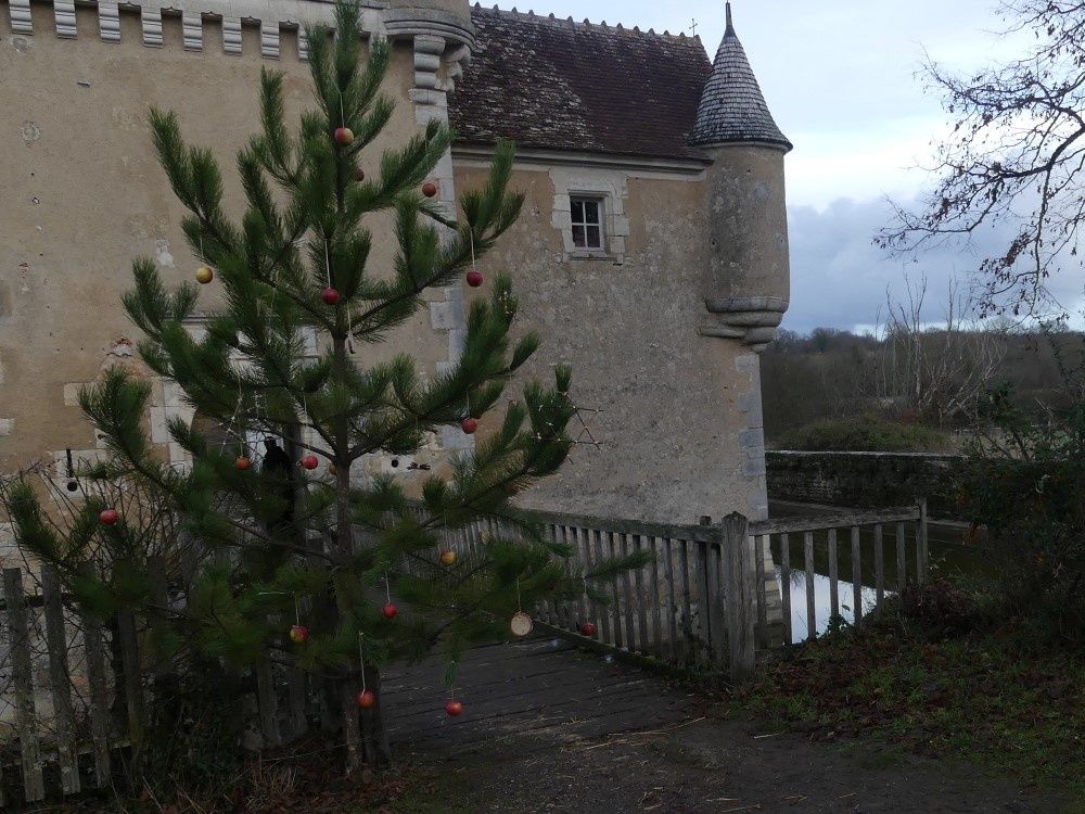 Un sapin nous accueille à l’entrée du château, modestement décoré de pommes rouges tandis que dans la cour du château des châtaignes grillent à l’intention des visiteurs. La modeste chapelle du château a été paillée de frais, Noël se prépare dans la douceur au Plaix.