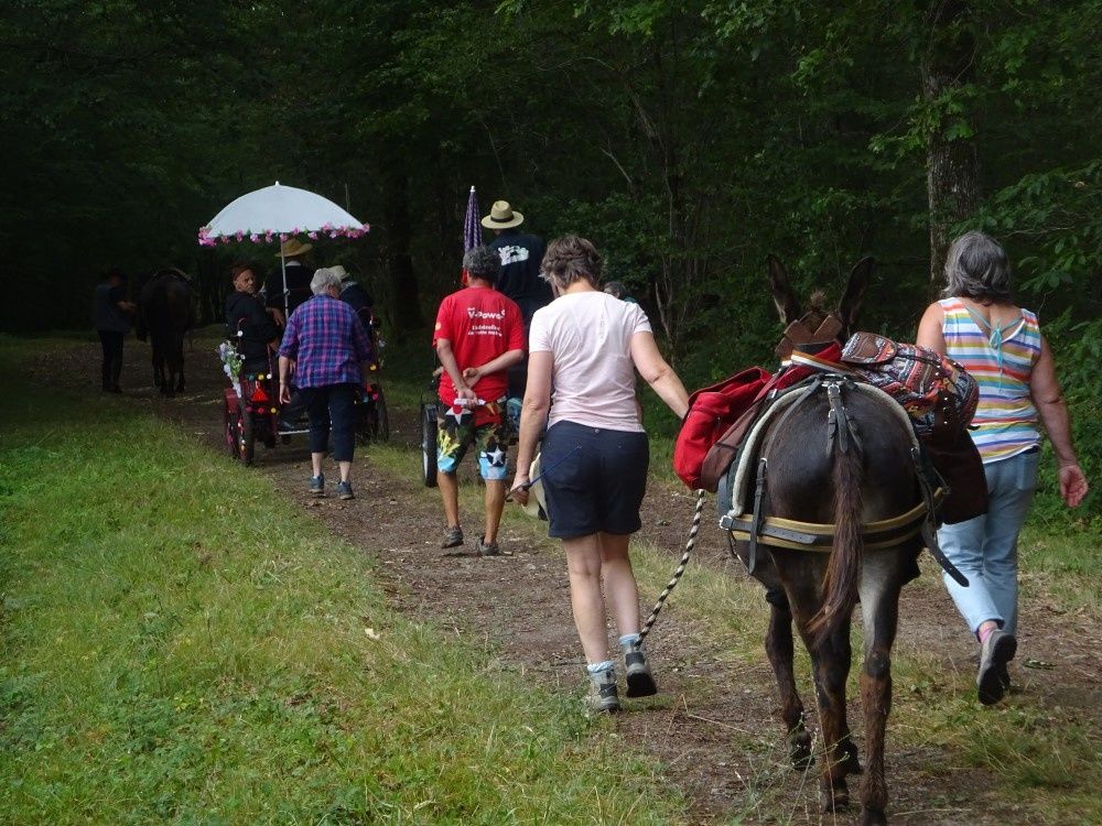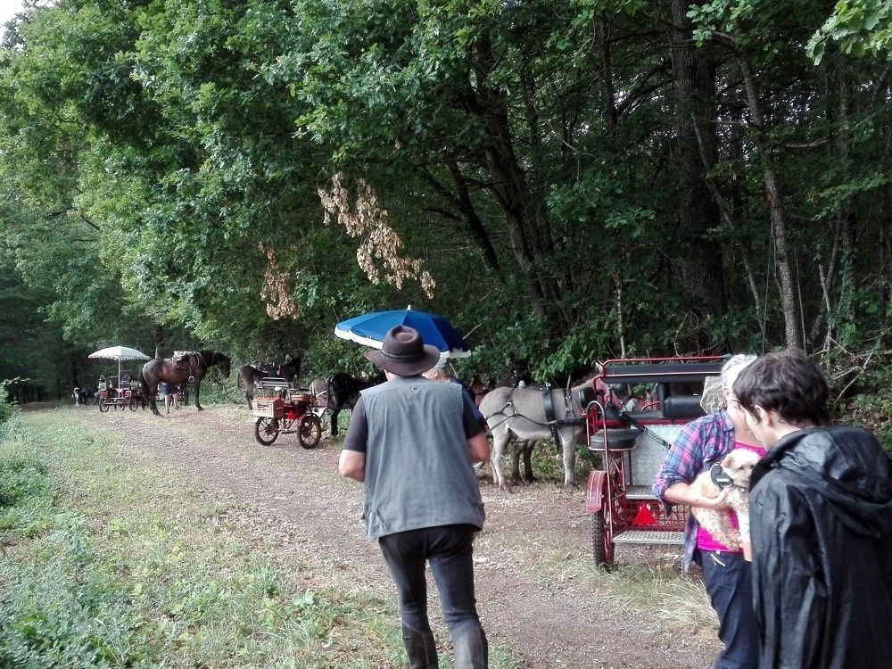 Les larges chemins ne posent pas de problème pour les charrettes ; en début de matinée il y eut bien une petite averse, rien de bien méchant. Bien sur, il fallut bien une petite adaptation des enfants à l’âne qu’ils empruntaient pour l’occasion. Et déjà le premier ravitaillement s’annonce ; mais quand on chemine avec un âne, avant de se ravitailler, il faut commencer par rechercher où attacher son âne !